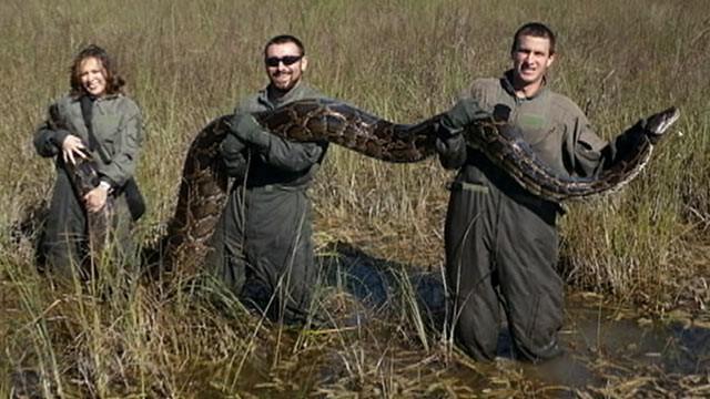 FlaPythonSome estimate that nearly 150,000 pythons are living in the Florida Everglades. Officials say the Burmese pythons are eating wildlife and with no natural predator, the population is overwhelming. The Everglades have become crowded with the snakes and the pythons have started to move into nearby neighborhoods. Last year, a Burmese python was caught and registered more than 17 feet long and 160 pounds. The catch set a new Everglades National Park record.